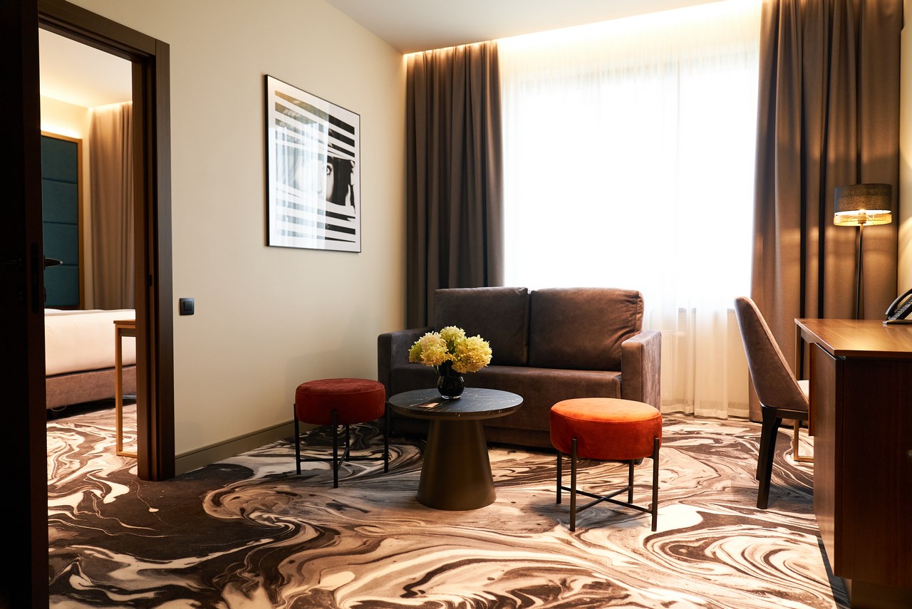 | Джуниор сюит 2-местный Junior Suite (с видом на город) | 32 кв.м. | 2 чел. | Мебель (вешалка, зеркало, кресла, кровать двуспальная, прикроватные тумбочки, стол, стулья, шкаф), О... | |